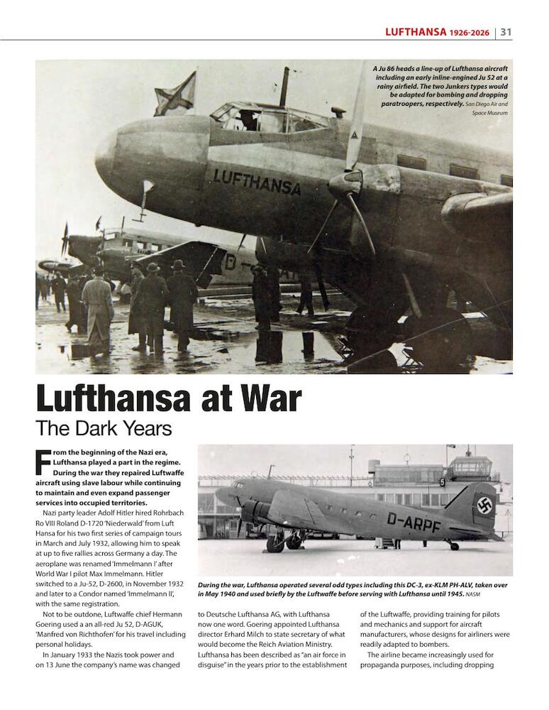 This year, Germany’s national airline celebrates 100 years since its founding. When it was formed as Deutsche Luft Hansa from the amalgamation of several small carriers in 1926 it inherited a fleet of 126 aircraft of 19 different types. In the interwar years Lufthansa operated land planes, flying boats and even airships and established new air connections between Europe, South America and the Far East. The company was almost an air force in disguise in the Nazi era, providing a market for German aircraft and training for future Luftwaffe pilots. During World War Two, civil flying stopped and the company became a repair organisation for the military. Declared part of the Luftwaffe, the company was liquidated in 1951, but reborn in 1953. Since then, Lufthansa has grown to become one of the world’s most respected international airlines, today flying to more than 180 destinations in 71 countries, operating 284 aircraft of seven families. Lufthansa 1926-2026, No 85 in the Aviation Archive series, covers the turbulent history of Lufthansa through archive photographs, detailed cutaway drawings and accurate profile paintings.