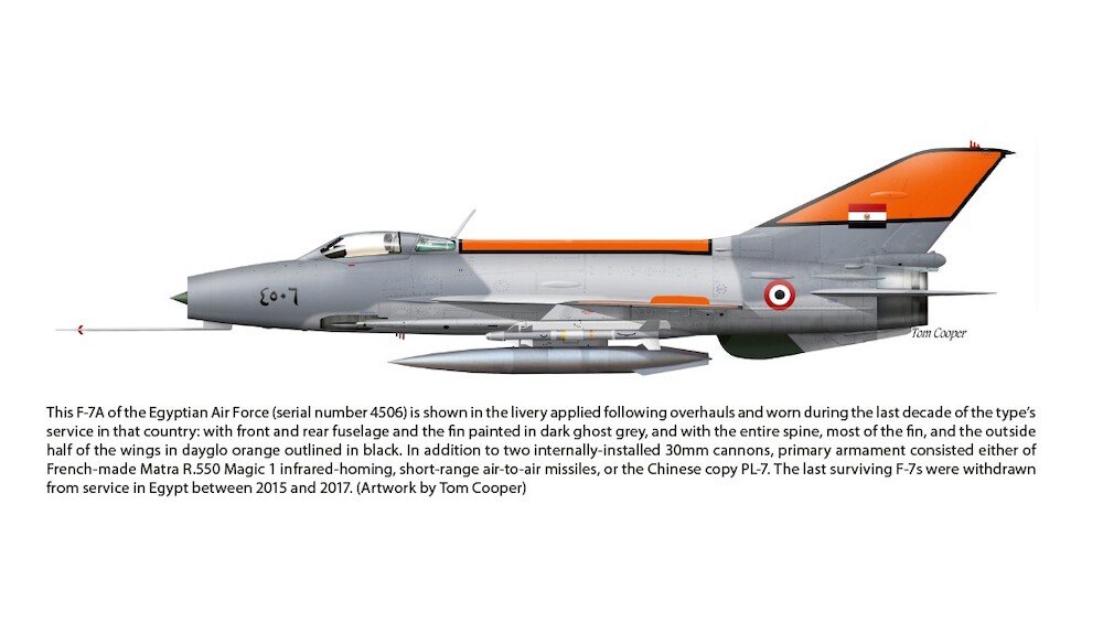 Initially working from component knock-down kits supplied by the USSR, the Chinese aircraft industry progressed from simple assembly, to copies of the MiG-21, through to domestic versions (the J-7) and export versions (the F-7 and two-seater FT-7). Constantly striving to introduce improvements and refinements, the F-7 would become a great export success for the People’s Republic, with modernised and upgraded variants still in service across the world to this day.
