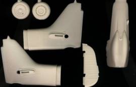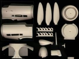 The parts include the following items. Left & Right engine cowling, left & right tail section with the fuselage extension molded in, new radio and fuel hatch, new rudder, upper gun decking, radiator gill ring, radiator grill and cowl, new spinner, three keyed prop blades, exhaust stacks, lower cowl and wheel well, DF loop antenna and mount, YZ 16 antenna, new wheels with manufacturer name and tire size molded in, and the super charger intake.