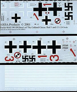 There are also two COMPLETE sets of decals for two different aircraft from Jagdverband 44. Red 1 w. nr. 600424 and Red 13 w.nr. 400240 with the correct style crosses and pilot's motto's on the fuselage side. The decals are of the individual variety and are extremely thin so they appear to be of the type that have been coming out of the Czech Republic. The art work was done for ARBA by Mick Gannon.