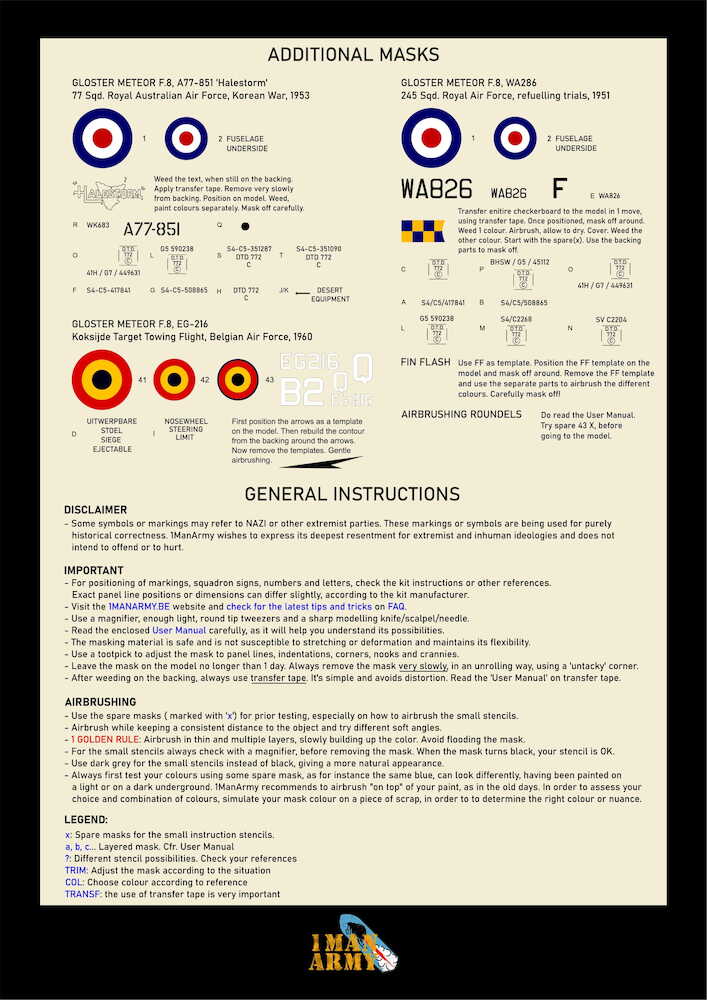 its innovative masks allow not only to airbrush markings, squadron numbers etc , but also the smallest instruction stencils, hereby offering an alternative for the decals with carrier film and allowing a true 'painted-on' result.
