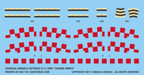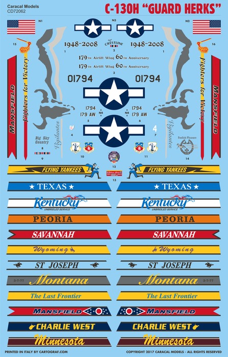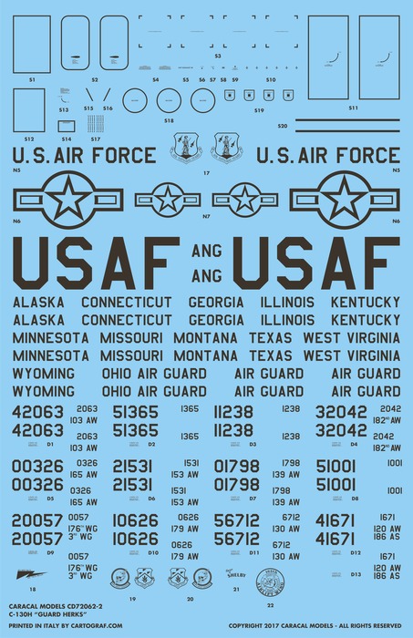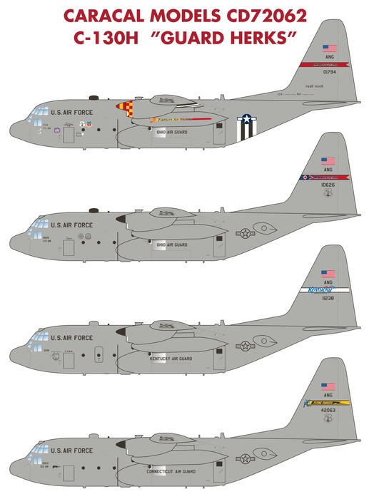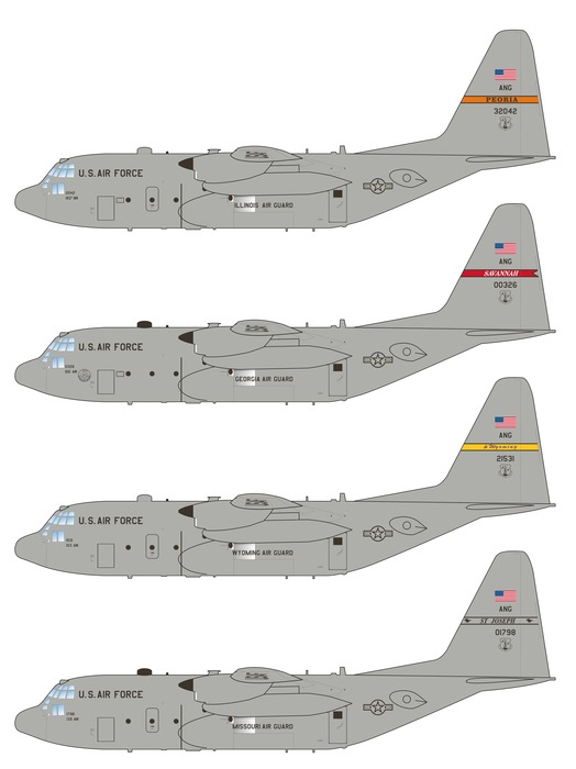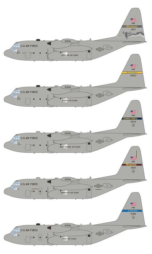 We provide markings for 13 different aircraft from twelve different states, including the colorful Ohio ANG 60th anniversary scheme from 2008. The set also features accurate, extensive stencilling as applied to the current USAF C-130 fleet.