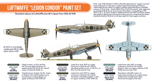 Most of Legion's planes wore standard Luftwaffe colours of that time - firstly RLM 63 (or RLM 02) overall, later replaced by standard RLM 61, 62 and 63 over 65 pattern.