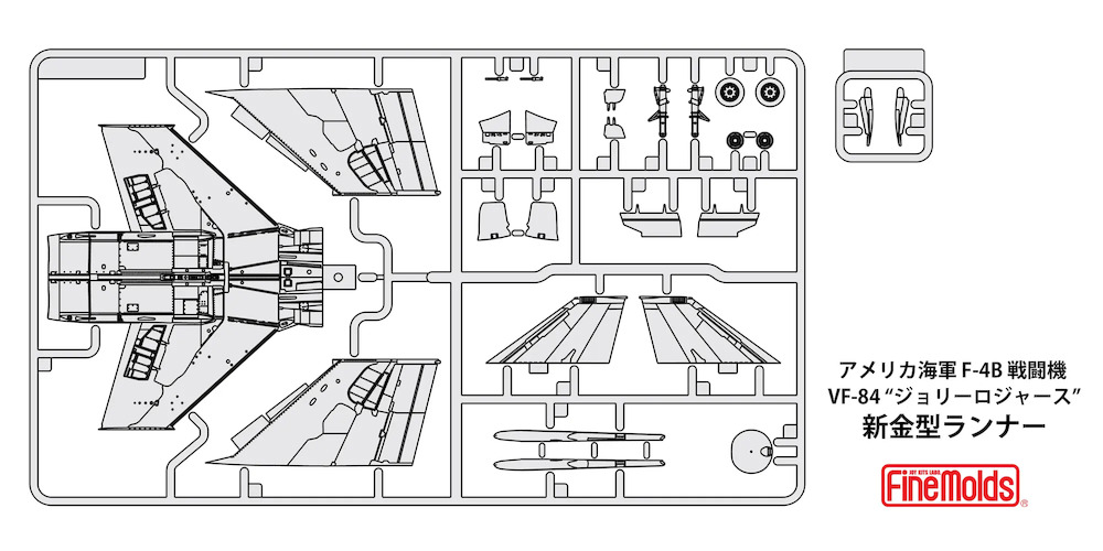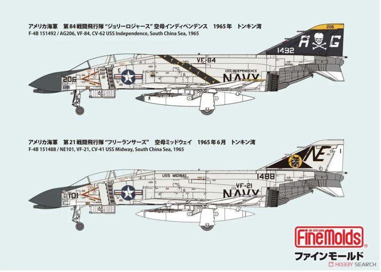Update with new decals and new parts of the large Fine Molds McDonnell Douglas F-4 Phantom II series, markings and new parts diagram is included in images below. The parts include a quite extensive change, as this is the first B variant released in the series, so the parts correct lot of parts including tail, engines and wings plus some small details. The new decal sheet include two markings, one for the VF-84 “Jolly Rogers” (1965 USS Independence) and one for the VF-21 Freelancers (1965 USS Midway).