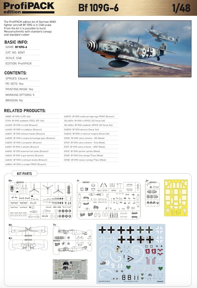 The ProfiPACK edition kit of German WWII fighter aircraft Messerschmitt Bf-109G-6 in 1/48 scale. From the kit it is possible to build Messerschmitts with standard canopy and standard rudder. Plastic parts: Eduard- marking options: 5- decals: Eduard - PE parts:pre-painted- painting mask: yes