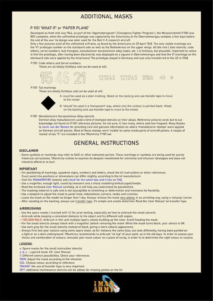its innovative masks allow not only to airbrush markings, squadron numbers etc , but also the smallest instruction stencils, hereby offering an alternative for the decals with carrier film and allowing a true 'painted-on' result.