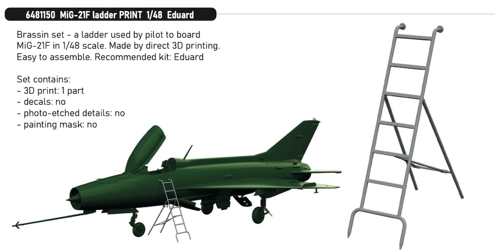 a ladder used by pilot to board MiG-21F in 1/48 scale. Made by direct 3D printing. Easy to assemble. Recommended kit: Eduard
