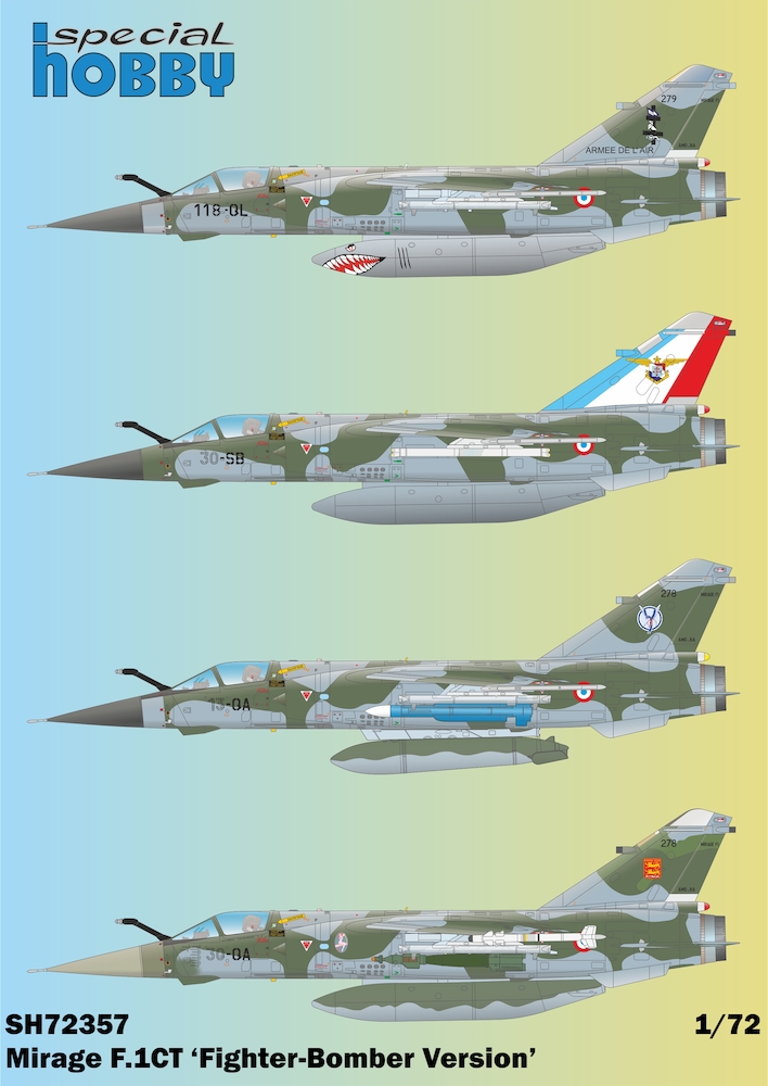 RE-RELEASED!!! Dassault Mirage F.1CT The Mirage F.1 owes its creation to a private initiative by Dassault. The Armee de l Air ordered the construction of two prototypes designated Mirage F.2 and F.3 with JTF10 engines. However, Dassault built another prototype with smaller dimensions and an Atar 9K engine at its own expense. This prototype, which flew for the first time on 23 December 1966, was selected and the production machines were introduced into the Armee de l'Air's inventory as the Mirage F.1C single-seat fighter and the Mirage F.1B two-seat trainer fighter. During the service, some Mirage F.1 machines were modified by attaching an IFR probe to the Mirage F.1C-200 version. The French Air Force also used two reconnaissance versions, the Mirage F. 1CR and the Mirage F.1CT converted from the Mirage F.1-200. The Armee de l'Air received a total of 246 of all Mirage F.1 versions. The Mirage F.1 also became a successful export item. In Europe, it was operated by Spain and Greece. In South America, Ecuador was the only operator, while in Africa and Asia, the Mirage F.1 flew in Gabon, South Africa, Morocco, Libya, Iran, Iraq, Jordan, Qatar and Kuwait. As a result, the Mirage F.1 was involved in many conflicts around the world, from mock duels between Greek fighters and Turkish opponents, through French actions in Chad, Ecuadorian border conflicts with Peru, battles between South African Mirages against Cuban aircraft from Angola, to participation in the war against Iraq, where Mirage F.1s were flown on both sides. Even today, the Mirage F.1 is in service with several countries.