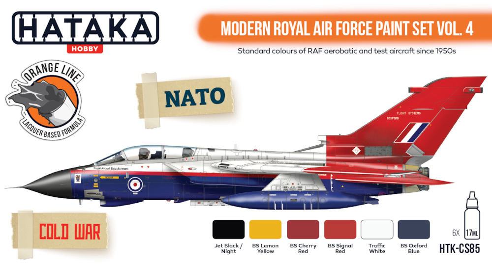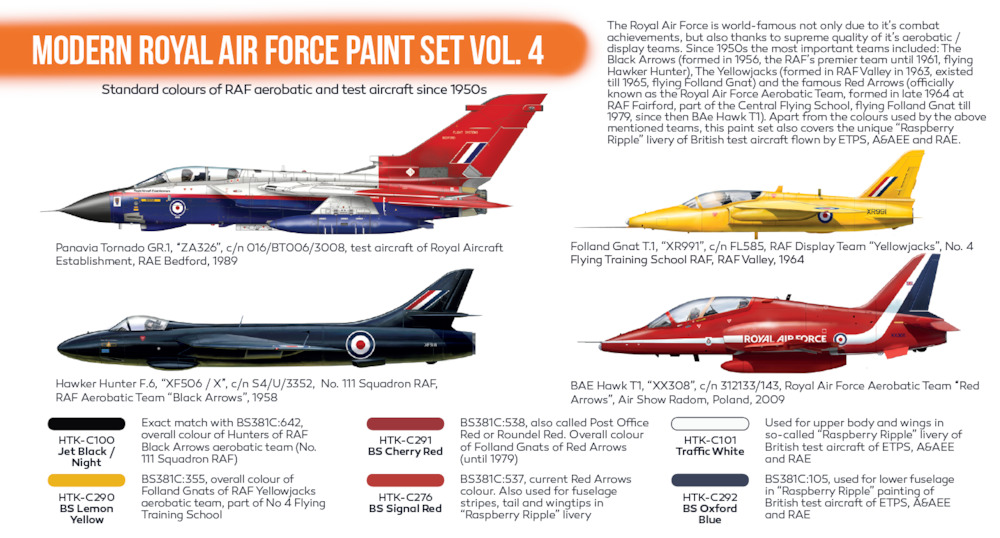 Apart from the colours used by the above mentioned teams, this paint set also covers the unique "Raspberry Ripple" livery of British test aircraft flown by ETPS, A&AEE and RAE.