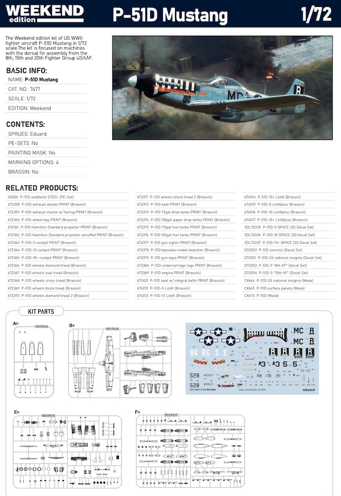 The Weekend edition kit of US WWII fighter aircraft North-American P-51D Mustang in 1/72 scale.The kit is focused on machines with the dorsal fin assembly from the 8th, 15th and 20th Fighter Group USAAF. Plastic parts: Eduard - marking options: 4 - decals: Eduard