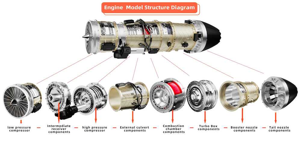 The lifelike & visually stunning model provides a realistic depiction of a full-sized engine with main components including a first-stage fan, two-stage low-pressure compressor, four-stage high-pressure compressor, first-stage high-pressure turbine, and two-stage low-pressure turbine.