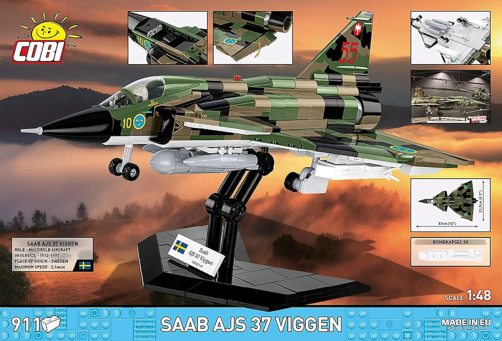 911 blocks - The set contains high-quality elements that allow for a precise reproduction of the Viggen's "canard" design, from the characteristic wings and cockpit equipment to realistic armament.